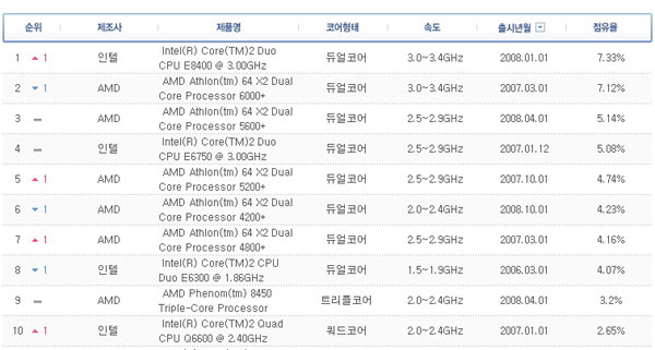CPUÀÇ °æ¿ì ÀüüÀûÀÌ Á¡À¯À²¸¸ µûÁö°í ºÃÀ» ¶§´Â AMD¿Í ÀÎÅÚÀÇ ¾þÄ¡¶ôµÚÄ¡¶ôÇϰí ÀÖÁö¸¸ ¿©ÀüÈ÷ AMDÂÊÀÌ ¾à°£ ¿ì¼¼ÇÑ »óȲÀÌ´Ù. 3ºÐ±âÀÇ ¼øÀ§¸¦ »ìÆìº¸¸é ÀÎÅÚÀÇ ¡®ÄÚ¾î2 µà¿À E8400¡¯ÀÌ Àüü¿¡¼ 7.33%¸¦ ±â·ÏÇÏ¸é¼ µåµð¾î 1À§¿¡ µî±ØÇßÁö¸¸ ÀÌ °á°ú°¡ ½ÃÀåÀÇ Å« ¿µÇâÀ» ¹ÌÄ¥ Á¤µµ´Â ¾Æ´Ï´Ù. ±× ÀÌÀ¯´Â 1À§¿Í 2À§¿ÍÀÇ Â÷À̰¡ Àû°í ¾ÆÁ÷±îÁö »óÀ§±Ç¿¡ AMD Á¦Ç°µéÀÌ ¸¹ÀÌ ·©Å©µÇ¾î Àֱ⠶§¹®ÀÌ´Ù.