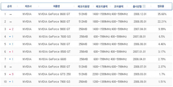 ±×·¡ÇÈ Ä«µåÀÇ °æ¿ì ¿©ÀüÈ÷ ¿£ºñµð¾ÆÀÇ ÁöÆ÷½º Á¦Ç°±ºÀÌ ¾ÐµµÀûÀÎ ¸ð½ÀÀ» °è¼Ó º¸À̰í ÀÖ´Ù. 1~10À§±îÁö ¸ðµÎ ÁöÆ÷½º°¡ Â÷ÁöÇÑ °ÍÀº ¹°·Ð 20À§±îÁö »ìÆìºÁµµ AMDÀÇ Á¦Ç°Àº HD3800°ú HD4670À» Á¦¿ÜÇϰí´Â ¾ÆÁ÷±îÁö ½ÃÀå¿¡ Å« ¿µÇâÀ» ¹ÌÄ¡°í ÀÖÁö ¸øÇÑ °ÍÀ¸·Î ³ªÅ¸³µ´Ù.