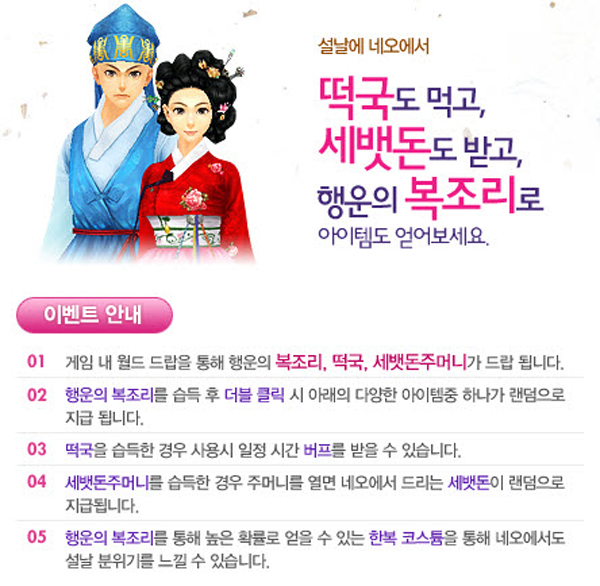 ³×¿À¿Â¶óÀο¡´Â 2¿ù 23ÀϱîÁö ·£´ýÇÏ°Ô ¾òÀ» ¼ö ÀÖ´Â Çà¿îÀÇ º¹Á¶¸®¸¦ ÅëÇØ 100¸í¿¡°Ô ³×¿À USB¸¦ Á¦°øÇϸç, ÀÌ¿Í ÇÔ²² ÃÊÄݸ´ »óÀÚ¸¦ ¸ðÀ¸´Â °ÔÀ̸ӿ¡°Ô´Â ÃÊÄݸ´À¸·Î ¸¸µé¾îÁø ¹«±â ÄÚ½ºÆ¬À» ¼±¹°ÇÑ´Ù. »þÀ̾߿¡´Â 2¿ù 17ÀϱîÁö ¹éÈ£ ¸ó½ºÅ͸¦ »ç³ÉÇÏ¸é ¾òÀ» ¼ö ÀÖ´Â ¹éÈÁ¡»óǰ±Ç, »þÀ̾ßij½Ã, GM»óÀÚ¸¦ ÅëÇØ °¢ »óǰ¿¡ ÀÀ¸ðÇÒ ¼ö ÀÖ´Â ±âȸ°¡ ÁÖ¾îÁö¸ç, ¹ß·»Å¸Àε¥ÀÌ ´çÀÏ¿¡ Á¢¼ÓÇÑ ¸ðµç °ÔÀ̸ӵ鿡°Ô ÃÊÄݸ´ ¾ÆÀÌÅÛÀ» ¼±¹°ÇÑ´Ù. ¶ÇÇÑ Ä³½Ã¾ÆÀÌÅÛÀ» ±¸¸ÅÇÏ´Â °ÔÀ̸ӵ鿡°Ô´Â 5%ÀÇ Ãß°¡ ¸¶Àϸ®Áö°¡ ÁÖ¾îÁø´Ù. ÀÌ ¹Û¿¡µµ °¢Á¾ À¥º¸µå °ÔÀÓ¿¡ Áñ±â¸é LCD TV, ¹éÈÁ¡»óǰ±Ç, ±èÄ¡³ÃÀå°í µîÀÇ °æÇ°À» ¹ÞÀ» ¼ö ÀÖÀ¸¸ç, 2010³â °æÀγ⠽ųâ¿î¼¼¸¦ ¹«·á·Î ¹ÞÀ» ¼ö ÀÖ´Â ÅäÁ¤ºñ°á°ú Ÿ·Î Á¡ À̺¥Æ®µµ ÁøÇàµÈ´Ù.