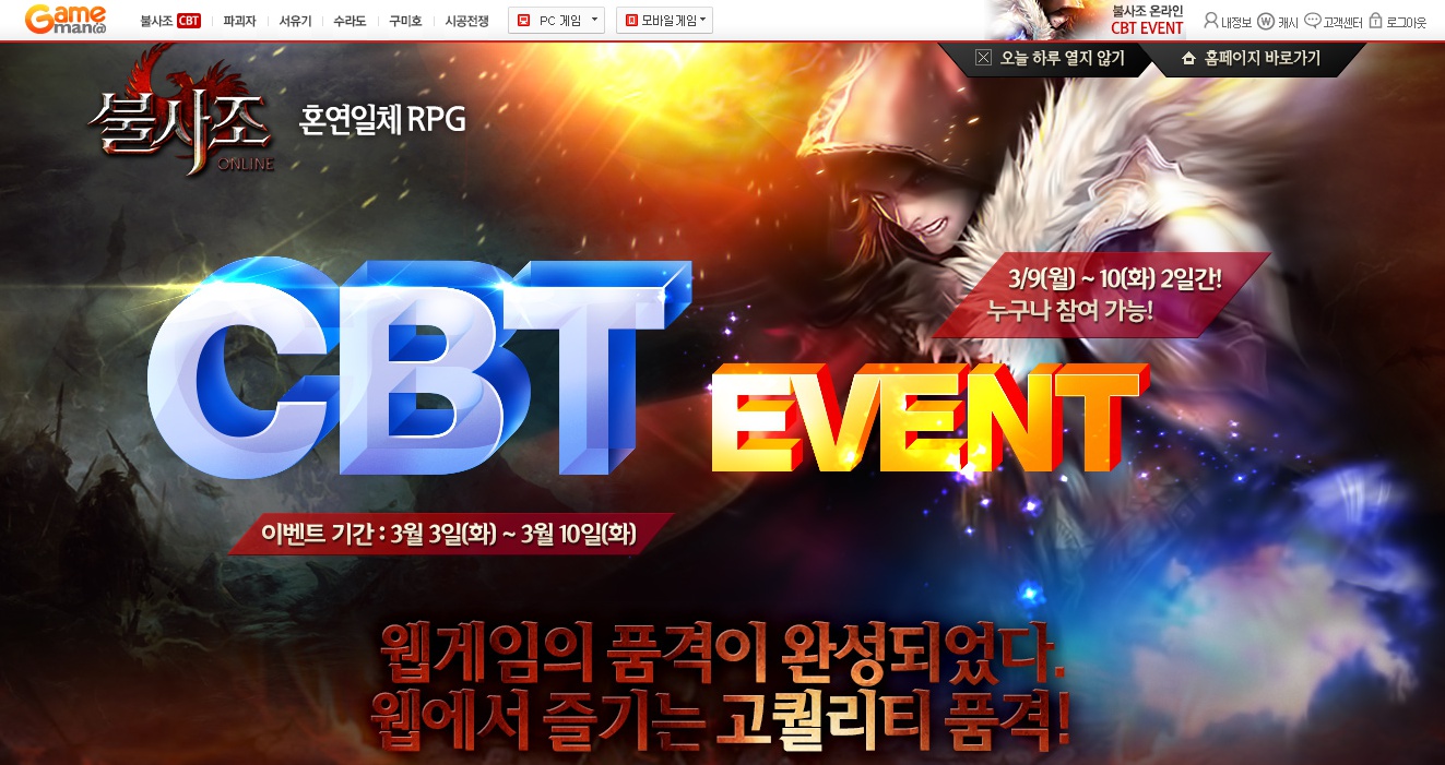 °ÔÀÓÆ÷ÅÐ °ÔÀӸŴϾƿ¡¼ ¿À´Ã ºÒ»çÁ¶¿Â¶óÀÎCBT ÁøÇàÇÕ´Ï´Ù. 9ÀÏ~10ÀÏ ÀÌÆ²°£ CBT¿¡ Âü¿©ÇÏ½Ç ¼ö ÀÖÀ¸¸ç, ½Ã°£Àº ¿ÀÈÄ 6½Ã ºÎÅÍÀÔ´Ï´Ù. ºÒ»çÁ¶¿Â¶óÀÎÀÇ ±×·¡ÇÈÀº 3D WEB GAMEÀ¸·Î ÀÌÀüÀÇ À¥ °ÔÀÓ¿¡¼´Â º¼ ¼ö ¾ø¾ú´ø ÀÚ¿¬½º·¯¿î ij¸¯ÅÍ ¸ð¼Ç°ú ¼ö·ÁÇÑ ¹è°æ, È·ÁÇÑ ½ºÅ³À» È®ÀÎÇÒ ¼ö ÀÖ½À´Ï´Ù. ºÒ»çÁ¶¿Â¶óÀÎÀÇ ³¯°³/ÀÇ»óÀº ³¯°³ÀÇ µî±ÞÀÌ ³ô¾ÆÁú¼ö·Ï°¡ÁöÀÇ È·ÁÇÑ ¿Ü°üÀ» ȽÅÇÒ ¼ö ÀÖ½À´Ï´Ù. ¶ÇÇÑ, ´Ù¾çÇÑ ÀÇ»ó ÄÚ½ºÆ¬À» ȹµíÇÒ ¼ö ÀÖÀ¸¸ç °È¸¦ ÅëÇØ ´õ¿í °ÇÑ ÀÇ»ó ȹµæÀÌ °¡´ÉÇÕ´Ï´Ù. ºÒ»çÁ¶¿Â¶óÀÎÀÇ ¾×¼Ç(PvP)´Â ±æµåÀü, °³ÀÎÀü, Çʵå ÀüÅõ, ÅëÇÕ ¼¹ö ÀüÀå µî ´Ù¾çÇÑ PvP¸¦ Á¦°øÇÕ´Ï´Ù. È·ÁÇÑ ½ºÅ³À» ÅëÇØ PvPÀÇ Â¥¸´ÇÑ ¼Õ¸ÀÀ» ´À³¥ ¼ö ÀÖ½À´Ï´Ù. ±âŸ ¾÷Àû½Ã½ºÅÛ / °È½Ã½ºÅÛ / ±æµå½Ã½ºÅÛµî ´Ù¾çÇÑ Àç¹Õ°Å¸®°¡ ÀÖÀ¸´Ï Çѹø µå·ç¿Í ÇØºÁµµ ÁÁÀ»°Í °°³×¿ä~¤¾¤¾
