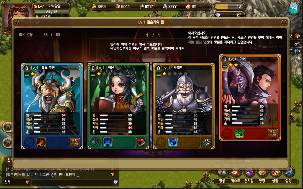 ¼Ò¿ï¼ÒµåÀÇ ¹é¹Ì´Â ¿µ¿õÄ«µå »Ì±â ÀÔ´Ï´Ù. 1¼º~5¼º±îÁöÀÇ ¿µ¿õÄ«µå°¡ ÀÖ¾î äÃëÇÑ ÀÚ¿øÀ» ÀÌ¿ëÇØ ·£´ýÀ¸·Î ´õ ÁÁÀº ¿µ¿õÄ«µå¸¦ »ÌÀ» ¼ö ÀÖ½À´Ï´Ù. Àú´Â 2¼ºÀÇ Ä«µå°¡ ¾È³ª¿À´õ±º¿ä... ê⺸´Ï 3¼º 4¼º ¸¹ÀÌ ³ª¿À½Ã´øµ¥..Á¦°¡ ¿îÀÌ ¾ø¾ú³ªº¾´Ï´Ù¤Ð