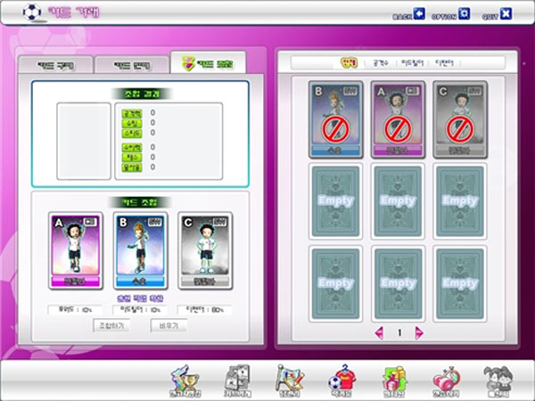 Ä«µå¿Í ¾ÆÀÌÅÛÀÇ ¼±Åà °ÔÀÓÀ» ÅëÇØ ¹úÀº ¸Ó´Ï·Î (´ÜÀ§:°ø) Ä«µå¿Í ¾ÆÀÌÅÛÀ» ±¸¸ÅÇÒ ¼ö°¡ ÀÖ´Ù. ¸ÞÀÎ ¸Þ´º¿¡¼ Ä«µå°Å·¡·Î µé¾î°¡¸é ±¸¸Å, ÆÇ¸Å, Á¶ÇÕÀÇ ±â´ÉÀÌ ÀÖ´Ù. Ä«µåÁ¶ÇÕÀº ¼¼ °¡ÁöÀÇ ÆÀ¿øÄ«µå¸¦ Á¶ÇÕÇÏ¿© ·£´ýÇÑ Ä«µå¸¦ »Ì´Â °³³äÀε¥, ¸» ±×´ë·Î ¾²Áö ¾Ê´Â ³ª»Û Ä«µåµé·Î´Â ÁÁÀº °ÍÀ» ¾ò¾î¿À°í ½ÍÀ» ¶§ ¾²´Â ¼ÀÀÌ´Ù. ¼±¼ö°¡ Ä«µå·Î µÇ¾îÀÖ°í, ¶Ç C~SSS±îÁö ´Ù¾çÇÑ µî±ÞÀÌ Á¸ÀçÇϹǷΠº¸´Ù À¯¸®ÇÑ °æ±â¸¦ À§Çؼ± Ä«µå±¸ÀÔÀÌ ÇʼöÀÌ´Ù(±¸¸Å ½Ã ·£´ýÇÑ µî±ÞÀÇ Ä«µåµéÀÌ »ÌÈû). ÇöÀç´Â ½ºÅ³Æ®¸®°¡ ±¸ÇöµÇÁö ¾Ê¾ÒÁö¸¸, ¾ÕÀ¸·Î ½ºÅ³±îÁö ±¸ÇöµÇ¸é Ä«µå¿Í ¾ÆÀÌÅÛ, ½ºÅ³±îÁö ½Å°æ½á¾ß ÇϹǷΠµ·À» ¾Æ³¢°í Ä«µåÀÇ ÀçȰ¿ëÀ» À§ÇØ Á¶ÇÕ ±â´ÉÀº ¸¹ÀÌ ¾Ö¿ëµÉ °ÍÀ¸·Î »ý°¢µÈ´Ù.