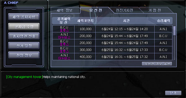 ÅëÁ¦Å¾ ¸Þ´º¿¡ ¸ð¼±Àü, °ÅÁ¡Àü, ¼¼·ÂÁ¤º¸ µîÀÇ Á¤º¸¸¦ ÇÑ ´«¿¡ ¾Ë¾Æº¼ ¼ö ÀÖ´Â ½Ã½ºÅÛÀÌ Ãß°¡ µÇ¾ú´Ù. ±× µ¿¾ÈÀº ¾ðÁ¦ ÀüÀïÀÌ ¹ß»ýÇØ¼ ¾î¶² °á°ú°¡ ³ªÅ¸³µ´ÂÁö ¾Ë ¼ö ¾ø¾úÀ¸³ª, ¾ÕÀ¸·Î´Â ƯÁ¤ ÀüÀï¿¡ Âü¿©ÇÒ ¼ö ¾ø´Ù ÇÏ´õ¶óµµ µµ½Ã ³» ÅëÁ¦Å¾À» ÀÌ¿ëÇØ ÀüÀï ¹ß¹ß ¿©ºÎ¿Í ±× °á°ú¸¦ È®ÀÎÇÒ ¼ö ÀÖ´Ù.
