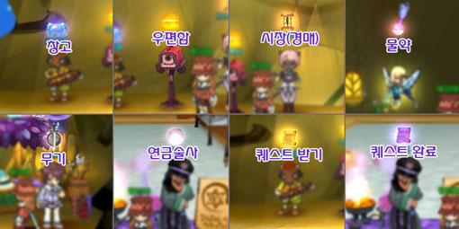 ¹«±â°¡ ¶° ÀÖ´Ù¸é ¹«±â/¹æ¾î±¸/ÀǺ¹ µîÀ» ±¸ÀÔÇÒ ¼ö ÀÖ´Â »óÁ¡ NPC, ¹°¾àÀÌ ¶°ÀÖ´Ù¸é ¹°¾à/±Íȯ¼ µîÀ» ±¸ÀÔÇÒ ¼ö ÀÖ´Â ¹°¾à NPC, ÁÖÆÇÀÌ ¶°ÀÖ´Ù¸é ¿ÀÁî ½ÃÀåÀ¸·ÎÀÇ ¿¬°á, º¸¹°ÇÔÀÌ ¶°ÀÖ´Ù¸é â°í, ÆíÁö°¡ ¶°ÀÖ´Ù¸é ¿ìÆíÇÔ(ÆíÁö º¸³»±â/¹Þ±â ±â´É), ³ë¶õ»ö ¶Ç´Â º¸¶ó»ö ÆíÁöÁö°¡ ¶°ÀÖ´Ù¸é Äù½ºÆ® ÁøÇà, ºû³ª´Â ±¸½½ÀÌ ¶°ÀÖ´Ù¸é ¿¬±Ý¼ú»çÀÌ´Ù.