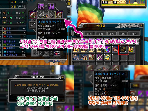 ¾ÆÀÌÅÛ °È´Â ÇöÀç º¸À¯Çϰí ÀÖ´Â ¾ÆÀÌÅÛÀ» Á» ´õ °ÇÏ°Ô ¸¸µé¾î ÁÖ´Â ±â´ÉÀ» Çϰí ÀÖ´Ù. Èû, ÀÇÁö, Áö´É¿¡ µû¸¥ 3°¡ÁöÀÇ ÁÖ¹®¼°¡ ÀÖÀ¸¸ç, »ó±Þ/Áß±Þ/ÇÏ±Þ µîÀÇ µî±Þ¿¡ µû¸¥ ºÐ·ùµµ ³ª´©¾îÁ® ÀÖ´Ù(3°¡Áö Áß ÇϳªÀÇ ´É·ÂÄ¡¸¦ ·£´ýÀ¸·Î °È½ÃÄÑÁÖ´Â Àǹ®ÀÇ °È ÁÖ¹®¼µµ ¸ó½ºÅ͸¦ ÅëÇØ ¹ÞÀ» ¼ö ÀÖÀ½). µî±ÞÀÌ ³·À»¼ö·Ï ÁÖ¹®¼ »ç¿ë ½Ã ¼º°ø È®·üÀÌ ³ôÀº ¹Ý¸é¿¡ °È ¼öÄ¡´Â Àû°í, µî±ÞÀÌ ³ôÀ»¼ö·Ï ¼º°ø È®·üÀÌ ³·Àº ¹Ý¸é¿¡ °È ¼öÄ¡´Â ¸¹°Ô Àû¿ëµÈ´Ù.