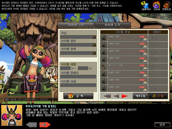 ¾ÆÀÌÅÛ °Å·¡ Áß°³ÀÎ NPC ÆÄ¶óÁê. ±× À̸§ ¿ª½Ã ÇѱÛÈ µÇ¾î Àç¹ÌÀÖ°Ô Ç¥ÇöµÇ¾ú´Ù. ÀÌ¿ëÀÚµéÀÌ µî·ÏÇÑ ÆÇ¸Å ¾ÆÀÌÅÛÀ¸·Î °¡µæÇÏ´Ù.