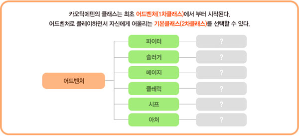¨ç ÆÄÀÌÅÍ: ¹«±â¿Í ½Åü¸¦ ¾²´Â ÀüÅõ Àü¹®°¡·Î ¹«°Å¿î ¹æ¾î±¸µµ °Å¶áÈ÷ Âø¿ë°¡´ÉÇϳª °ø°Ý, ȸº¹ µîÀÇ ¸¶¹ý ½ºÅ³ ½ÀµæÀº ºÒ°¡´ÉÇÏ´Ù. ¨è ½½·¯°Å: ¸¶¹ý»ç °è¿·Î °¢Á¾ ¼Ó¼ºÀÇ °ø°Ý ¸¶¹ýÀ» ´Ù·ê ¼ö ÀÖ´Ù. ¨é Ŭ·¹¸¯: Èú¸µÀ» ºñ·ÔÇÑ È¸º¹ ¸¶¹ýÀÇ Àü¹®°¡·Î ºû°ú ¾îµÒÀÇ ¼Ó¼ºÀ» ´Ù·ê ¼ö ÀÖ´Ù. ¨ê ½ÃÇÁ: ´øÀü Ž»öÀÇ Àü¹®°¡·Î ¸öÀ» ¼û±â´Â ±â¼ú°ú ÇÔÁ¤À» ¼³Ä¡ÇÏ´Â ±â¼úÀÌ ÀÖ¾î ÆÄÆ¼Ç÷¹ÀÌ¿¡ ÇÊ¿äÇÑ ¿ªÇÒÀ» ¼öÇàÇÑ´Ù. ¨ë ¾ÆÃ³: ¿ø°Å¸® °ø°Ý¿¡ ´ÉÇÏ¸ç Æ¯È÷ »ç°Ý¹«±âÀÇ Àü¹®°¡ÀÌ´Ù. Ȱ °ø°Ý »Ó ¾Æ´Ï¶ó °·ÂÇÑ ´ëÆ÷¸¦ »ç¿ëÇÒ ¼ö ÀÖ´Ù.