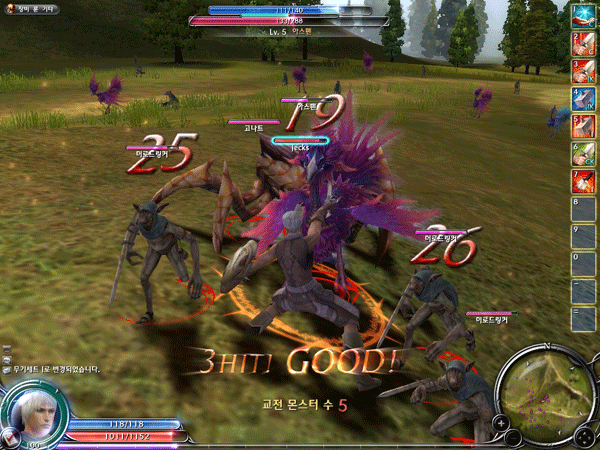 Á¦¶ó°¡ ¹ßÇ¥ µù½ÃºÎÅÍ ÁÖ¸ñÀ» ¹Þ¾Ò´ø ÀÌÀ¯ Áß ÇϳªÀÎ ÀÏ´ë ´Ù ÀüÅõ. È®½ÇÈ÷ °ÔÀÓ »ó¿¡¼ »ó´çÈ÷ ºü¸£°í ´ÙÀ̳ª¹ÍÇÑ ÀüÅõ¸¦ º¸¿©ÁØ´Ù. ÇÊµå »ó¿¡ ÀÖ´Â ÇϳªÀÇ ¸ó½ºÅ͸¦ °ø°ÝÇÏ°Ô µÇ¸é ÇÑ ¹ø¿¡ ÃÖ´ë 5¸¶¸®ÀÇ ¸ó½ºÅÍ¿Í ½Î¿ì°Ô µÇ¸ç, ±Ùó¿¡ ÀÖ´Â ÀûµéÀÌ Ç÷¹À̾îÀÇ °ø°Ý¿¡ ¹ÝÀÀÇÏ¿© ¸ð¿©µé°Ô µÈ´Ù. ¶§¹®¿¡ Ç÷¹À̾îÀÇ °ø°ÝÀÌ ÀÌ·ç¾îÁú ¶§ ´Ü¼øÇÑ È®Àå ´ë¹ÌÁö°¡ ¾Æ´Ï¶ó °ø°Ý ±ËÀûÀ» µû¶ó ±×´ë·Î Àûµé¿¡°Ô ´ë¹ÌÁö°¡ µé¾î°¡°Ô µÇ´Â °ÍÀÌ´Ù. Çѹø Ŭ¸¯À» ÇØ µÎ°í ÇϳªÀÇ ÀûÀ» Á×ÀÎ µÚ¿¡ ´ÙÀ½ ÀûÀ» Á׿´´ø ÀÌÀüÀÇ MMORPGµé°ú´Â È®¿¬È÷ Â÷À̰¡ ³ª´Â ÀüÅõ ½ºÅ¸ÀÏÀÌ´Ù.