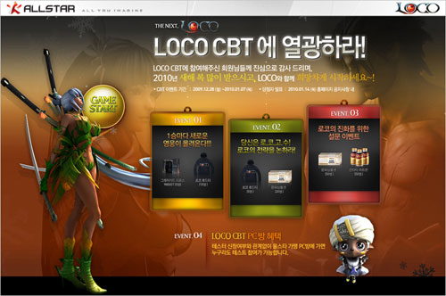 KTH(´ëÇ¥ ¼Á¤¼ö) '¿Ã½ºÅ¸'(www.allstar.co.kr)´Â Àڻ翡¼ ¼ºñ½º ¿¹Á¤ÀÎ ½ÅÀÛ ¡®·ÎÄÚ(LOCO)¡¯ÀÇ 1Â÷ ºñ°ø°³Å×½ºÆ®(ÀÌÇÏ CBT: Closed Beta Test)¸¦ ±ÝÀÏ(28ÀÏ)ºÎÅÍ 30ÀϱîÁö 3ÀÏ µ¿¾È ÁøÇà ÇÑ´Ù°í ¹àÇû´Ù.