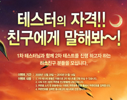 ÇϿ︵½îµå 1Â÷ CBT¿¡ Âü¿©Çß´ø ¸ðµç Å×½ºÅ͵鿡°Ô 3¸íÀÇ Ä£±¸¸¦ ÃÊ´ëÇÒ ¼ö ÀÖ´Â ¡®Ä£±¸ÃÊ´ë ÄíÆù¡¯ ¹øÈ£°¡ Áö±ÞµÇ¸ç, ÀÌ ÄíÆùÀ» ÅëÇØ Å×½ºÆ®¿¡ Âü¿©ÇÑ ¸ðµç Å×½ºÅ͵鿡°Ô´Â ÃֽŠMP3¿¡ ´ç÷±âȸ°¡ Á¦°øµÈ´Ù. ¡®Ä£±¸ÃÊ´ë ÄíÆù¡¯ÀÌ ¾ø´Â À¯ÀúµéÀº 1¿ù 14ÀÏ ÀÌÀü¿¡ ȨÆäÀÌÁö¿¡ °¡ÀÔ¸¸Çϸé 2Â÷ CBT Å×½ºÅÍ ¹× À̺¥Æ®¿¡ ÀÀ¸ðÇÒ ±âȸ°¡ Á¦°øµÈ´Ù.