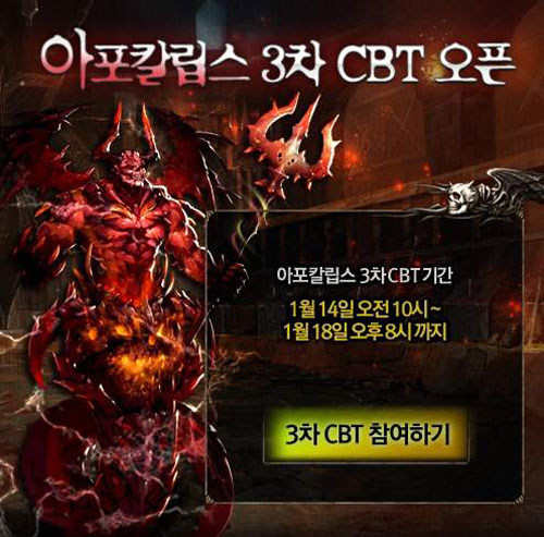 µ¿¾ç¿Â¶óÀÎ(´ëÇ¥ ¿ÀŰæ, www.tyonline.co.kr)ÀÌ ¼ºñ½ºÇϰí Ç÷οì°ÔÀÓÁî(´ëÇ¥ ±èÇåÁØ)°¡ ¼ø¼ö ±¹»ê ±â¼ú·Î ±¹³» ÃÖÃÊ °³¹ßÇÑ ·ÑÇ÷¹À×(RPG) À¥ °ÔÀÓ '¾ÆÆ÷Ä®¸³½º¡¯(APOCALYPS) 3Â÷ ºñ°ø°³Å×½ºÆ®(CBT)°¡ 14ÀÏ ¿ÀÀü 10½ÃºÎÅÍ 18ÀÏ ¿ÀÈÄ 8½Ã±îÁö ÁøÇàµÈ´Ù.