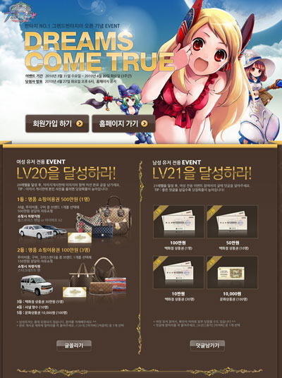 ·¹º§ 21À» ´Þ¼ºÇÑ ³²¼º À¯Àú¶ó¸é ¿©¼º À¯Àú Âü¿©ÀÚ¿¡°Ô ÀÀ¿ø µ¡±ÛÀ» ÅëÇØ À̺¥Æ®¿¡ ÀÀ¸ðÇÒ ¼ö ÀÖ´Ù. Ãß÷À» ÅëÇØ 1µî 1¸í¿¡°Ô´Â 100¸¸¿øÀÇ ¹éÈÁ¡ »óǰ±ÇÀ», 2µî 10¸í°ú 3µî 30¸í¿¡°Ô °¢°¢ 50¸¸¿ø±Ç°ú 30¸¸¿ø±ÇÀÇ ¹éÈÁ¡ »óǰ±Ç ÁõÁ¤Çϸç, 100¸í¿¡°Ô 1¸¸¿ø±Ç ¹®È»óǰ±ÇÀ» °æÇ°À¸·Î Àü´ÞÇÑ´Ù.