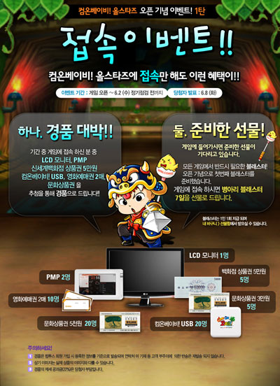 ÄÄÅõ½º´Â ¡®ÄĿº£À̺ñ! ¿Ã½ºÅ¸ÁÀÇ ¿ÀǺ£Å¸Å×½ºÆ®(OBT)¸¦ ±â³äÇØ 6¿ù 2ÀϱîÁö °ÔÀÓ¿¡ Á¢¼ÓÇÏ´Â À¯Àú Àü¿ø¿¡°Ô ¾ÆÀÌÅÛÀ» Áö±ÞÇϰí, ÀÏÁÖÀÏ °£ »ç¿ëÇÒ ¼ö ÀÖ´Â ¡®º´¾Æ¸® ºí·¡½ºÅÍ¡¯¸¦ Á¦°øÇÑ´Ù. ¶Ç Ç÷¹ÀÌ 10ºÐ ´ç º° 2°³¾¿À» Áö±ÞÇϰí, ¼öÁýÇÑ º°·Î LCD ¸ð´ÏÅÍ, PMP, ¹éÈÁ¡ »óǰ±Ç µî ǪÁüÇÑ °æÇ°¿¡ ÀÀ¸ðÇÒ ¼ö ÀÖ´Â À̺¥Æ®µµ µ¿½Ã¿¡ ½Ç½ÃÇÑ´Ù.