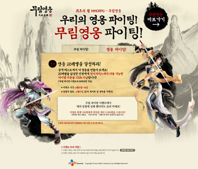 °ÔÀÓÆ÷ÅÐ ³Ý¸¶ºí(www.netmarble.net, ´ëÇ¥ÀÌ»ç ³²±Ã ÈÆ)ÀÌ MMORPG À¥°ÔÀÓ <¹«¸²¿µ¿õ>ÀÇ °ø°³ Å×½ºÆ®¸¦ ½Ç½ÃÇÑ´Ù. À̹ø °ø°³Å×½ºÆ®´Â ¿À´Â 14ÀϱîÁö ÁøÇàµÉ ¿¹Á¤À¸·Î, ³ë¿¹ ½Ã½ºÅÛÀ» µµÀÔÇÑ Â÷º°ÈµÈ PVP½Ã½ºÅÛ°ú ´Ù¾çÇÑ °æÀï ¹× Ä¿¹Â´ÏƼ ¿ä¼Ò¸¦ °®Ãá RPG À¥°ÔÀÓ <¹«¸²¿µ¿õ>À» ¹Ì¸® üÇèÇÒ ¼ö ÀÖ´Ù. <¹«¸²¿µ¿õ>Àº źźÇÑ ½ºÅ丮¿Í ÄÜÅÙÃ÷·Î Áß±¹¿¡¼ 10´ë À¥°ÔÀÓ¿¡ ²ÅÈ÷¸ç ±¹³»¿¡¼µµ RPG À¥°ÔÀÓÀ̶ó´Â Â÷º°ÈµÈ °ÔÀÓ ¿ä¼Ò·Î Àα⸮¿¡ ¼ºñ½º ÁßÀÌ´Ù. ±ò²ûÇÑ ±×·¡ÇÈÀ» ¹ÙÅÁÀ¸·Î °£ÆíÇÑ ÀÎÅÍÆäÀ̽º¿Í Ŭ¸¯ Çϳª·Î °ÔÀÓÀÌ °¡´ÉÇØ ´©±¸³ª ½±°Ô °ÔÀÓ¿¡ Âü¿©ÇÒ ¼ö ÀÖ°í, ³ë¿¹ °ü°è ¼º¸³À» ÅëÇÑ °æÇèÄ¡ º¸»ó µîÀ¸·Î RPGÀÇ À°¼ºÀÇ Àç¹Ì¿Í ÇÔ²² ±âÁ¸ ¿Â¶óÀΰÔÀÓ°ú´Â ÀüÇô »ö´Ù¸¥ À¥°ÔÀÓ PVPÀÇ Àç¹Ì¸¦ °æÇèÇÒ ¼ö ÀÖ´Ù. <¹«¸²¿µ¿õ>ÀÇ À̹ø Å×½ºÆ®´Â ³Ý¸¶ºí ȸ¿øÀÌ¸é ´©±¸³ª Âü¿© °¡´ÉÇϸç, Âü°¡ÇÑ Àü¿ø¿¡°Ô Á¤½Ä ¼ºñ½º¿¡ »ç¿ë °¡´ÉÇÑ ¾ÆÀÌÅÛ ÄíÆùÀ» ÁõÁ¤ÇÏ´Â µî dz¼ºÇÑ À̺¥Æ®µµ ÁøÇàÇÑ´Ù. Ãß÷À» ÅëÇØ 300¸í¿¡°Ô ³Ý¸¶ºíij½¬¸¦ Áö±ÞÇϰí Å×½ºÆ® ±â°£¿¡ 20·¹º§À» ´Þ¼ºÇÏ´Â »ç¿ëÀÚ Àü¿ø¿¡°Ô ¾ÆÀÌÅÛ ÄíÆùÀ» Ãß°¡·Î Áö±ÞÇÑ´Ù. <¹«¸²¿µ¿õ>Àº ¿ùµåÄÅ ±â°£À» ¸Â¾Æ ƼÀú»çÀÌÆ®¸¦ ÅëÇØ ÁøÇàÇÑ ±¹°¡´ëÇ¥ ÀÀ¿ø ´ñ±Û À̺¥Æ®¿¡ õ¿©¸íÀÌ Âü¿©ÇÏ´Â µî °ø°³ Å×½ºÆ®¿Í Á¤½Ä ¼ºñ½º¿¡ ´ëÇÑ ±â´ë°¨À» ³ôÀ̰í ÀÖ´Ù. <¹«¸²¿µ¿õ>Àº °ø°³ Å×½ºÆ®¸¦ ¸¶Ä¡°í ¿À´Â 15ÀÏ Á¤½Ä ¼ºñ½º¸¦ ½Ç½ÃÇÒ °èȹÀÌ´Ù. ÀÚ¼¼ÇÑ »çÇ×Àº <¹«¸²¿µ¿õ> °ø½Ä »çÀÌÆ®(murimhero.netmarble.net)¸¦ ÂüÁ¶ÇÏ¸é µÈ´Ù. °ÔÀÓÆ÷ÅÐ ³Ý¸¶ºíÀº <¹«¸²¿µ¿õ>ÀÇ Ã¤³Î¸µ ¼ºñ½º·Î ±âÁ¸ ¡®Ä¥¿ëÀü¼³¡¯, ¡®À¥»ï±¹Áö¡¯¿Í ÇÔ²² °¢°¢ ƯÀ¯ÀÇ Â÷º°ÈµÈ ÄÜÅÙÃ÷·Î ±¸¼ºµÈ À¥°ÔÀÓ ¶óÀξ÷À» °®Ãß°Ô µÇ¾úÀ¸¸ç, °æ¿µ ½Ã¹Ä·¹ÀÌ¼Ç À¥°ÔÀÓ < ¹Ì½ºÅÍCEO >µµ 6¿ù Áß ¼ºñ½º¸¦ ÁøÇàÇÒ °èȹÀÌ´Ù.
