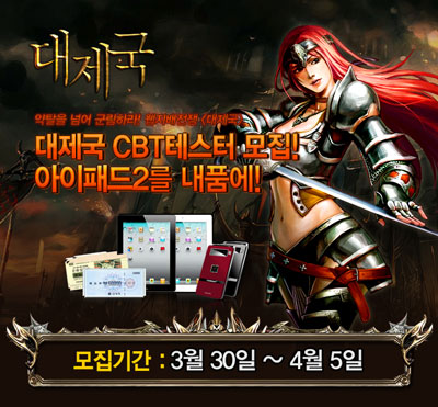 <´ëÁ¦±¹>ÀÇ 1Â÷ ºñ°ø°³ Å×½ºÆ®¸¦ À§ÇÑ Å×½ºÅÍ ¸ðÁýÀº 3¿ù 30ÀϺÎÅÍ 4¿ù 5ÀϱîÁö 7Àϰ£ <´ëÁ¦±¹>ÀÇ °ø½Ä ȨÆäÀÌÁö(http://ge.webgamech.com) ¸¦ ÅëÇØ ÁøÇàµÇ°í, 12¼¼ ÀÌ»óÀÇ ±¹³» À¯ÀúµéÀ̸é À¥°ÔÀÓä³Î ȸ¿ø°¡ÀÔ ÈÄ ´©±¸³ª ½ÅûÀÌ °¡´ÉÇÏ´Ù. ´ç÷ÀÚ´Â 4¿ù 6ÀÏ °ø½Ä ȨÆäÀÌÁö¸¦ ÅëÇØ ¹ßÇ¥µÈ´Ù.