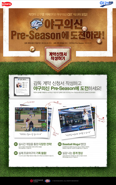 ¢ß³×¿ÀÀ§Áî°ÔÀÓÁî(´ëÇ¥ À±»ó±Ô)´Â ÀÚü °³¹ß ½ÅÀÛ ¾ß±¸ ¸Å´ÏÁö¸ÕÆ® °ÔÀÓ ¡®¾ß±¸Àǽš¯¿¡¼ ºñ°ø°³Å×½ºÆ®(CBT) Âü°¡ÀÚ ¸ðÁýÀ» ±ÝÀÏ(22ÀÏ)ºÎÅÍ ÁøÇàÇÑ´Ù°í ¹àÇû´Ù.