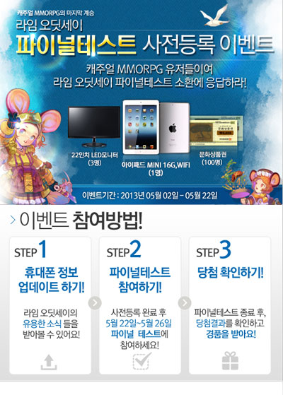 ´ÙÀ½Ä¿¹Â´ÏÄÉÀ̼Ç(´ëÇ¥ ÃÖ¼¼ÈÆ)Àº ½ÎÀÌÄ¿£ÅÍÅ×ÀÎ¸ÕÆ®(´ëÇ¥ ±è»ó±Ù)¿¡¼ °³¹ßÇÑ ¡®¶óÀÓ ¿Àµ÷¼¼ÀÌ : ¸ðÇèÀÇ ½ÃÀÛ¡¯(ÀÌÇÏ ¶óÀÓ ¿Àµ÷¼¼ÀÌ)ÀÇ ÆÄÀ̳ΠÅ×½ºÆ®¸¦ 5¿ù 22ÀϺÎÅÍ 5Àϰ£ ÁøÇàÇÑ´Ù°í ¹ßÇ¥Çß´Ù. ijÁÖ¾ó MMORPGÀÇ ¸¶Áö¸· °è½ÂÀ» ¾Ë¸®´Â ¡®¶óÀÓ ¿Àµ÷¼¼ÀÌ¡¯ÀÇ ÆÄÀ̳ΠÅ×½ºÆ®´Â 5¿ù 22ÀϺÎÅÍ 26ÀϱîÁö ÁøÇàµÇ¸ç, ´ÙÀ½ ¾ÆÀ̵𸸠ÀÖÀ¸¸é °£´ÜÇÑ ½Åû ÀýÂ÷¸¦ °ÅÃÄ ½±°Ô Å×½ºÆ®¿¡ Âü°¡ÇÒ ¼ö ÀÖ´Ù. À̹ø Å×½ºÆ®´Â ¿ÀÇ º£Å¸ Å×½ºÆ®(OBT)¸¦ ¾ÕµÎ°í ¸¶Áö¸·À¸·Î ÁøÇàµÇ´Â Å×½ºÆ®·Î, »ýȰ Á÷¾÷, EP(Extreme point) ½Ã½ºÅÛ, ³óÀå ½Ã½ºÅÛ µî OBT¿¡¼ Á¦°øµÇ´Â ´ëºÎºÐÀÇ ÄÜÅÙÃ÷¸¦ 40·¹º§±îÁö °æÇèÇØº¼ ¼ö ÀÖ´Ù. ÃÖ±Ù °ÔÀÓ ½ÃÀåÀ» Àå¾ÇÇϰí ÀÖ´Â ¼ºÀÎÃþ Ÿ°Ù °ÔÀÓµé »çÀÌ¿¡¼ ¡®¶óÀÓ ¿Àµ÷¼¼ÀÌ¡¯´Â ÆÄ½ºÅÚdzÀÇ ±×·¡ÇȰú µ¿ÈÀû ¿ä¼Ò¸¦ ´ã¾Æ Àü¿¬·ÉÃþÀ» ¾Æ¿ì¸¦ ¼ö ÀÖÀ» °ÍÀ¸·Î ´õ¿í ±â´ë¸¦ ¸ðÀ¸°í ÀÖ´Ù. Å×½ºÆ®¿¡ ¾Õ¼ ´ÙÀ½Àº ¿À´ÃºÎÅÍ 22ÀϱîÁö »çÀü µî·Ï À̺¥Æ®¸¦ ½Ç½ÃÇÑ´Ù. ¶óÀÓ ¿Àµ÷¼¼ÀÌ È¨ÆäÀÌÁö(http://lime.daum.net)¸¦ ÅëÇØ »çÀü µî·Ï¸¸ ÁøÇàÇÏ¸é ¸ð´ÏÅÍ, ¾ÆÀÌÆÐµå¹Ì´Ï µî ǪÁüÇÑ °æÇ°À» ȹµæÇÒ ¼ö ÀÖ´Ù. ´ÙÀ½ ÇãÁø¿µ °ÔÀÓ¼ºñ½ºº»ºÎÀåÀº ¡°±×µ¿¾È ¡®¶óÀÓ ¿Àµ÷¼¼ÀÌ¡¯¸¦ ±â´Ù·Á¿Â À¯ÀúµéÀÌ Áñ°Ì°Ô °ÔÀÓÀ» °æÇèÇÒ ¼ö ÀÖµµ·Ï ÃæºÐÈ÷ ÁغñÇß´Ù¡±¸ç ¡°À̹ø ÆÄÀ̳ΠÅ×½ºÆ®¸¦ ¼º°øÀûÀ¸·Î ¸¶Ä£ ÈÄ ºü¸£°Ô OBT¸¦ ÁøÇàÇÒ °èȹÀÌ´Ï ¸¹Àº °ü½É ºÎŹ µå¸°´Ù¡±¶ó°í ¹àÇû´Ù. ¡®¶óÀÓ ¿Àµ÷¼¼ÀÌ¡¯´Â ÀϺ» À¯¸í ÀÏ·¯½ºÆ®·¹ÀÌÅÍ ¡®ÇÏIJ¡¯ÀÇ ¿øÈ¸¦ ¹ÙÅÁÀ¸·Î ÇÑ ¹à°í ÄèȰÇÑ ±×·¡ÇȰú ÅëÄèÇÑ ¾×¼ÇÀÇ MMORPGÀÌ´Ù. Â¥¸´ÇÑ ÀüÅõ¿Í ¾Æ±âÀÚ±âÇÑ »ýȰÇü ÄÜÅÙÃ÷¸¦ °®Ãß°í ÀÖÀ¸¸ç, ¹à°í µû¶æÇÑ ´À³¦ÀÇ ±×·¡ÇÈÀ» ¹ÙÅÁÀ¸·Î ¼Á¤ÀûÀÎ ºÐÀ§±â°¡ ¾î¿ì·¯Á® ³²³à³ë¼Ò ´©±¸¶óµµ ½±°Ô Á¢±ÙÇÒ ¼ö ÀÖ´Â °ÔÀÓÀÌ´Ù. À̹ø ÆÄÀ̳ΠÅ×½ºÆ®¿¡ ´ëÇÑ ÀÚ¼¼ÇÑ ³»¿ëÀº ´ÙÀ½ ¶óÀÓ ¿Àµ÷¼¼ÀÌ È¨ÆäÀÌÁö(http://lime.daum.net)¿¡¼ È®ÀÎÇÒ ¼ö ÀÖ´Ù.