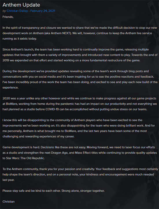 EA°¡ ¼ºñ½ºÇÏ°í ¹ÙÀÌ¿À¿þ¾î ¿¡µå¸ÕÅÏ(Edmonton) ½ºÆ©µð¿À°¡ °³¹ßÇÑ SF ¿ÀÇ ¿ùµå TPS ¡®¾Ø¼¶(Anthem)¡¯ÀÌ ´ë±Ô¸ð ÄÜÅÙÃ÷ ¼öÁ¤ ¹× ¾÷µ¥ÀÌÆ®¸¦ Ãë¼ÒÇϰí Çö »óȲÀ» À¯ÁöÇϱâ·Î Çß´Ù. »ç½Ç»ó °³¹ß Áß´Ü ¼±¾ðÀÌ´Ù.