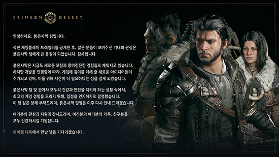 ÆÞ¾îºñ½º°¡ ½ÅÀÛ ¡®ºÓÀº»ç¸·(Crimson Desert)¡¯ Ãâ½Ã ÀÏÁ¤À» ¿¬±âÇß´Ù. 2021³â 4ºÐ±â Ãâ½Ã ¿¹Á¤À̾úÀ¸³ª 7¿ù 29ÀÏ °ø½Ä SNS(ÆäÀ̽ººÏ, Æ®À§ÅÍ, µð½ºÄÚµå)¸¦ ÅëÇØ ÀÏÁ¤ ¿¬±â¸¦ ¹ßÇ¥Çß´Ù. ÀÌ¿¡ µû¶ó °ÔÀÓ Ãâ½ÃÀÏÀº ÃÖ¼Ò 2022³â ȤÀº ±× ÀÌÈİ¡ µÉ Àü¸ÁÀÌ´Ù.