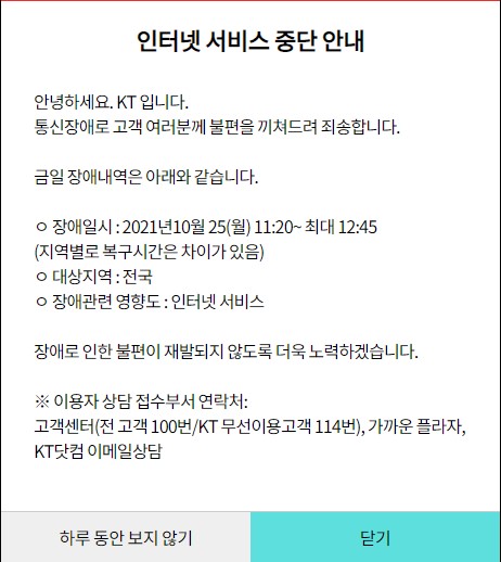 2021³â 10¿ù 25ÀÏ ¿ÀÀü 11½Ã 10ºÐ°æºÎÅÍ KT ÀÎÅÍ³Ý Àü±¹ Åë½Å¸ÁÀÌ ¸¶ºñµÇ´Â »ç°í°¡ ¹ß»ýÇß´Ù. Åë½Å¸Á ¸¶ºñ´Â »ç¿ëÀÚ º° Â÷ÀÌ´Â ÀÖÀ¸³ª 12½Ã 50ºÐ°æ±îÁö À̾îÁ³´Ù.