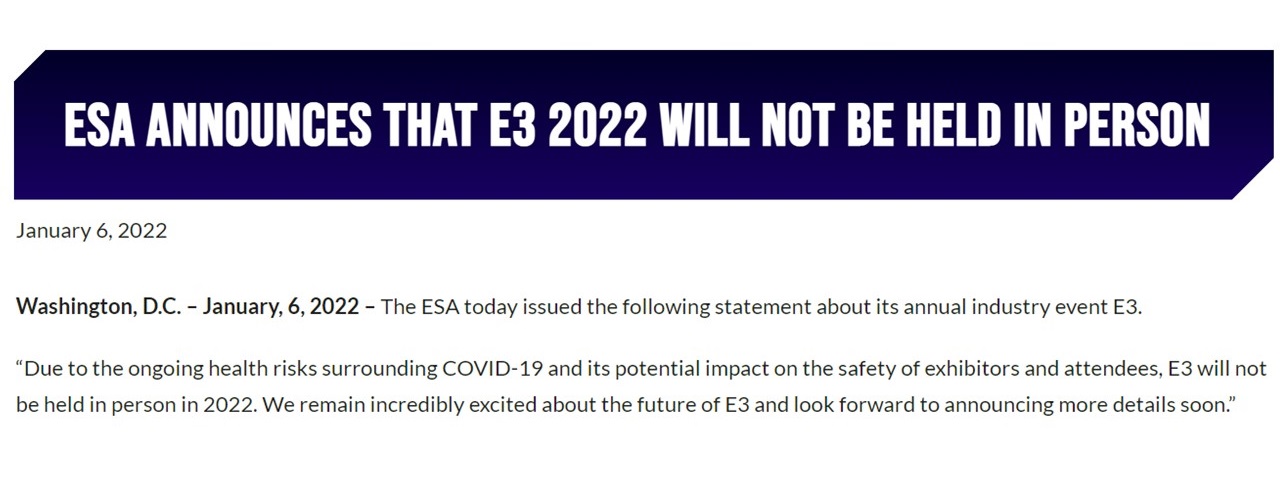 E3¸¦ ÁÖ°üÇÏ´Â ¹Ì±¹ °ÔÀÓ »ê¾÷Çùȸ(Entertainment Software Association, ÀÌÇÏ ESA)´Â °ø½Ä ȨÆäÀÌÁö ¼º¸íÀ» ÅëÇØ ÀÌ °°Àº »ç½ÇÀ» ¾Ë·È´Ù. ÁÖÃÖ ÃøÀº "E3´Â Äڷγª-19¸¦ µÑ·¯½Ñ °Ç°­»ó À§Çè, ±×¸®°í Âü¼®ÀÚµé ¾ÈÀü¿¡ ¹ÌÄ¥ ÀáÀçÀû ¿µÇâÀ» °í·ÁÇØ ´ë¸é °³ÃÖÇÏÁö ¾Ê´Â´Ù"¶ó°í ¸»Çß´Ù.
