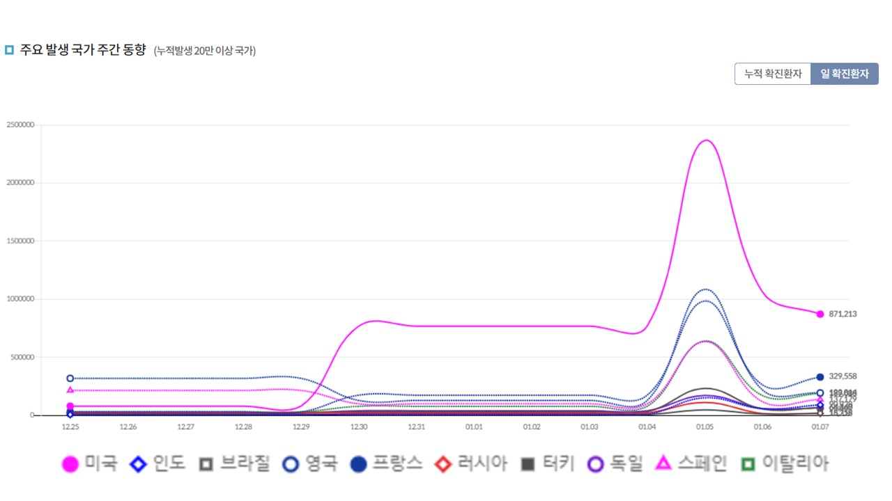 ¼¼°èº¸°Ç±â±¸(World Health Organization, WHO)¿¡ µû¸£¸é E3 °³ÃÖÁö ¹Ì±¹ ÁÖ°£ Æò±Õ Äڷγª 19 È®ÁøÀÚ´Â ¼º¸íÀÌ ¹ßÇ¥µÈ 1¿ù 6ÀÏ ±âÁØ 57¸¸ 5õ ¸íÀÌ´Ù. ÀÏ È®ÁøÀÚ´Â 80¸¸ ¸íÀ» ³Ñ¾î¼¹´Ù. ¹ß»ý·ü(100¸¸ ¸í ´ç È®ÁøÀÚ ¹ß»ý ¼ö)Àº 179,951·Î, 12,828ÀÎ Çѱ¹ ´ëºñ 10¹è ÀÌ»ó ³ô´Ù.