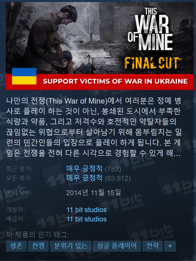 ¿À´ÃºÎÅÍ 7ÀÏ °£ '³ª¸¸ÀÇ ÀüÀï(½ºÆÀ °ø½Ä ¹ø¿ª¸í. ¿øÁ¦ 'This War of Mine')' ¼öÀÍ±Ý Àü¾×ÀÌ ¿ìÅ©¶óÀ̳ª Áö¿ø¿¡ »ç¿ëµÈ´Ù.
