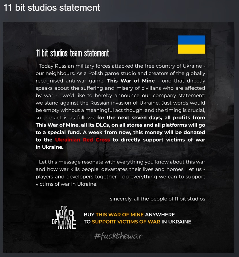 °³¹ß»ç 11 ºñÆ® ½ºÆ©µð¿À´Â ¿ìÅ©¶óÀ̳ª ÀüÀï ÇÇÇØÀÚ Áö¿øÀ» ¼±¾ðÇϰí, 7ÀÏ °£ '³ª¸¸ÀÇ ÀüÀï' °ÔÀÓ º»Æí ¹× DLC, »ç¿îµåÆ®·¢ µî °ü·Ã ÆÇ¸Å¼öÀÍ Àü¾×À» ¿ìÅ©¶óÀ̳ª Àû½ÊÀÚ¿¡ ±âºÎÇÑ´Ù°í ¹àÇû´Ù. ¶ÇÇÑ ÇØ´ç ±â°£ µ¿¾È ÆÇ¸Å·® Áõ°¡¸¦ À§ÇØ ÇÒÀÎ Çà»ç¿¡ µ¹ÀÔÇÑ´Ù.