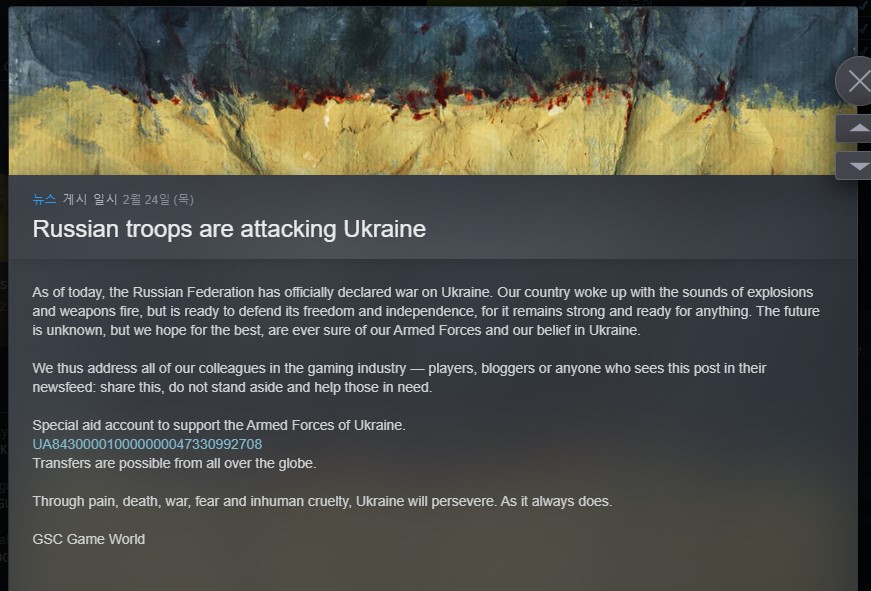 ÇÑÆí ¿ìÅ©¶óÀ̳ª¿¡ À§Ä¡ÇÑ °³¹ß»ç GSC °ÔÀÓ ¿ùµå´Â °³¹ßÁßÀÎ °ÔÀÓ '½ºÅäÄ¿ 2(S.T.A.L.K.E.R 2')' °øÁö¸¦ ÅëÇØ "°íÅë°ú Á×À½, ÀüÀï, °øÆ÷, ±×¸®°í ºñ Àΰ£ÀûÀÎ ÀÜÀÎÇÔ ¼Ó¿¡¼ ¿ìÅ©¶óÀ̳ª´Â ±ÁÈ÷Áö ¾Ê°í À̰ܳ¾ °ÍÀÌ´Ù"¶ó¸ç ¿ìÅ©¶óÀ̳ª¿¡ ´ëÇÑ ÁöÁö¸¦ È£¼ÒÇß´Ù.