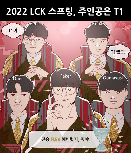 T1Àº ¡®LCK¡¯ 10ÁÖ³âÀ» ¸Â´Â 2022³â ½ÃÁ𠽺ÇÁ¸µ¿¡ ¡®LoL¡¯ e½ºÆ÷Ã÷ ÃÖÃÊ V10(10½Â), ¡®LCK¡¯ ÃÖÃÊ ¡®Àü½Â ¿ì½Â¡¯ ´ë±â·ÏÀ» ¼¼¿ü´Ù. »ó±Ý 1¾ï ¿ø°ú ÁÖ¾ó¸® ÇϿ콺 ƼÆÄ´Ï(Tiffany & Co.)°¡ Á¦ÀÛÇÑ ¿ì½Â ±â³ä ¹ÝÁö¸¦ ¹Þ¾Ò´Ù. ÆÄÀ̳ΠMVP´Â Á¤±Û·¯ ¡®¿À³Ê¡¯ ¹®ÇöÁØÀÌ ¼±Á¤µÆ´Ù.