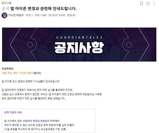 īī¿À°ÔÀÓÁî´Â 4¿ù 7ÀÏ ¸ð¹ÙÀÏ RPG ¡®°¡µð¾ð Å×ÀÏÁ °ø½ÄÄ«Æä¸¦ ÅëÇØ ¾Û ¾ÆÀÌÄÜ º¯°æÀ» °øÁöÇß´Ù. °øÁö¿¡ µû¸£¸é ¾Û ¾÷µ¥ÀÌÆ®¸¦ À§Çؼ´Â ¸ÕÀú ¸¶ÄÏ ½É»ç¸¦ Åë°úÇØ¾ß ÇÏÁö¸¸, ±×µ¿¾È ½É»ç °úÁ¤¿¡¼ ¹®Á¦°¡ ¾ø¾ú´ø ¡®¸®¸®½º¡¯ ¾Û ¾ÆÀÌÄÜÀÌ ¸¶ÄÏ ¼±Á¤¼º Á¤Ã¥¿¡ À§¹ÝµÈ´Ù´Â »çÀ¯·Î ÇöÀç ¾÷µ¥ÀÌÆ® ¹öÀüÀÌ ¸¶ÄÏ ½É»ç¸¦ Åë°úÇÏÁö ¸øÇß´Ù.