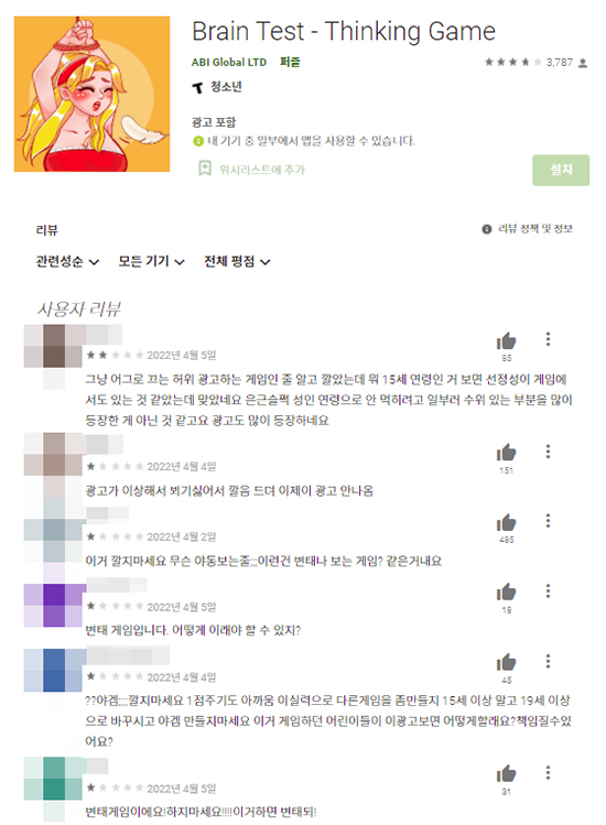 ¶ÇÇÑ, °ü·Ã °ÔÀÓ Áß ÇϳªÀÎ ¡®Brain Test - Thinking Game¡¯Àº ¼±Á¤ÀûÀÎ ³»¿ëÀ» ÁöÀûÇÏ´Â ºÎÁ¤ÀûÀÎ ¸®ºä°¡ °¡µæÇÏ´Ù. û¼Ò³âÀÌ Ç÷¹ÀÌ °¡´ÉÇÑ µî±ÞÀÓ¿¡µµ °ÔÀӻ簡 Á¦½ÃÇÑ °ÔÀÓ ½ºÅ©¸°¼¦À» º¸¸é ¼±Á¤ÀûÀÎ ³»¿ëÀ» È®ÀÎÇÒ ¼ö ÀÖ´Ù.