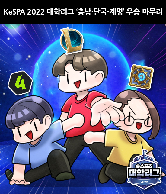 ¹®ÈüÀ°°ü±¤ºÎ°¡ ÁÖÃÖÇϰí Çѱ¹e½ºÆ÷Ã÷Çùȸ(Korea e-Sports Association, KeSPA)°¡ ÁÖ°üÇÏ´Â Àü±¹ ´ÜÀ§ ´ëÇÐ e½ºÆ÷Ã÷ ¸®±× ¡®2022 e½ºÆ÷Ã÷ ´ëÇи®±×¡¯°¡ 8¿ù 27ÀÏ, 28ÀÏ ¿¸° °á¼±À» ÅëÇØ Ãæ³²´ëÇб³(ÀÌÇÏ Ãæ³²´ë), ´Ü±¹´ëÇб³(ÀÌÇÏ ´Ü±¹´ë), °è¸í´ëÇб³(ÀÌÇÏ °è¸í´ë) ¿ì½ÂÀ¸·Î ¸¶¹«¸®µÆ´Ù.