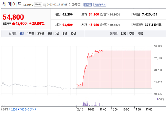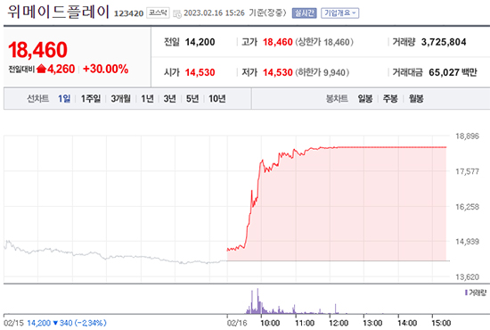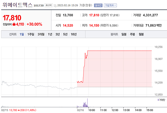 2¿ù 16ÀÏ À§¸ÞÀ̵å´Â Àü³¯ Á¾°¡ 42,200¿ø¿¡¼­ 29.86% ¿À¸¥ 54,800¿øÀ¸·Î ÀåÀ» ¸¶ÃÆ´Ù. À§¸ÞÀÌµå¸Æ½º´Â 2¿ù 15ÀÏ Á¾°¡ 13,700¿ø¿¡¼­ 30% ¿À¸¥ 17,810¿øÀ¸·Î, À§¸ÞÀ̵åÇ÷¹ÀÌ´Â 2¿ù 15ÀÏ Á¾°¡ 14,200¿ø¿¡¼­ 30% ¿À¸¥ 18,460¿øÀ¸·Î ÀåÀ» ¸¶°¨Çß´Ù.