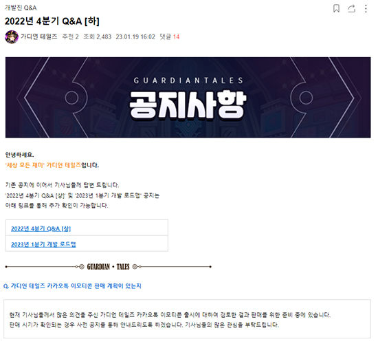 2022³â 12¿ù 17ÀϺÎÅÍ 1¿ù 5ÀϱîÁö īī¿À°ÔÀÓÁî´Â ¡®°¡µð¾ð Å×ÀÏÁ À¯Àú ÀǰßÀ» ¸ðÀ¸°í ´äº¯Çϱâ À§ÇÑ 4ºÐ±â Q&A ¼³¹® Á¶»ç¸¦ ÁøÇàÇß´Ù. Áú¹®°ú ´äº¯Àº [»ó]¡¤[ÇÏ]·Î ³ª´µ¾î °ø°³µÆ°í ±×Áß¿¡´Â īī¿ÀÅå À̸ðƼÄÜ °ü·Ã Áú¹®°ú ´äº¯µµ ÀÖ¾ú´Ù.