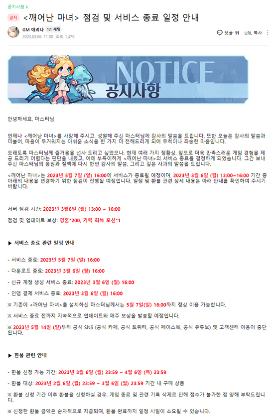 ¿ä½ºÅ¸´Â Çȼ¿ ³×ÄÚ ½ºÆ©µð¿À°¡ °³¹ßÇÑ ¸ð¹ÙÀÏ RPG ¡®±ú¾î³ ¸¶³à¡¯ ±¹³» ¼ºñ½º¸¦ 5¿ù 7ÀÏ Á¾·áÇÑ´Ù. 2021³â 11¿ù 10ÀÏ ±¹³» Ãâ½Ã ÈÄ 544ÀÏ ¸¸ÀÌ´Ù. 3¿ù 6ÀÏ ´Ù¿î·Îµå¿Í °áÁ¦¸¦ Â÷´ÜÇß°í ½Å±Ô °èÁ¤ »ý¼º ¼ºñ½ºµµ ³¡³Â´Ù. 4¿ù 6ÀϱîÁö ȯºÒ ½ÅûÀ» ¹Þ´Â´Ù.