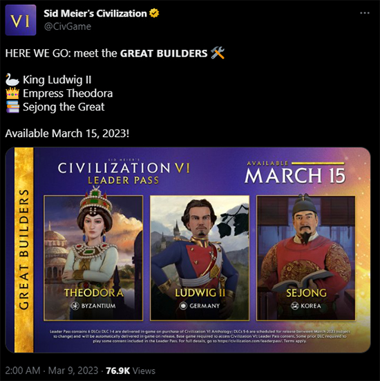3¿ù 9ÀÏ ¡®¹®¸í 6¡¯¸¦ °³¹ßÇÑ ÆÄÀ̶ô½Ã½º °ÔÀÓÁî´Â SNS¸¦ ÅëÇØ ¡®¸®´õ ÆÐ½º¡¯ ½Å±Ô ÄÜÅÙÃ÷ ¡®À§´ëÇÑ °Ç¼³ÀÚ¡¯¸¦ °ø°³Çß´Ù. °ø°³µÈ ³»¿ë¿¡ µû¸£¸é »õ·Î Ãß°¡µÉ ÁöµµÀÚ´Â ¼¼Á¾´ë¿Õ°ú Å׿Àµµ¶ó, ·çµåºñÈ÷ 2¼¼´Ù. 3¿ù 15ÀÏ ¾÷µ¥ÀÌÆ®¸¦ ÅëÇØ »ç¿ëÇÒ ¼ö ÀÖ´Ù. »ó¼¼ Ư¼ºÀº °ø°³µÇÁö ¾Ê¾Ò´Ù.