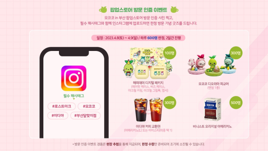 ¶ÇÇÑ, ÆË¾÷ ½ºÅä¾î¿¡¼´Â ºÎ䡤Æ÷½ºÅÍ¡¤¿±¼¡¤½ºÆ¼Ä¿ µî ¡®¸ðÄÚÄÚ¡¯ ±ÂÁ ¹æ¹®°´¿¡°Ô ¼±Âø¼øÀ¸·Î Áö±ÞÇÑ´Ù. ¹æ¹® ÀÎÁõ¼¦À» SNS¿¡ ³²±ä À¯Àú ´ë»óÀ¸·Î ¹«¼± À̾îÆù ÄÉÀ̽º°¡ Æ÷ÇÔµÈ ¡®ÇØÇǵ¥ÀÌ µðÁöÅÐ ÆÐŰÁö¡¯, ¸ðÄÚÄÚ µð¿À¶ó¸¶ ÇÇ±Ô¾î µîÀ» Ãß÷À» ÅëÇØ Á¦°øÇÒ ¿¹Á¤ÀÌ´Ù.