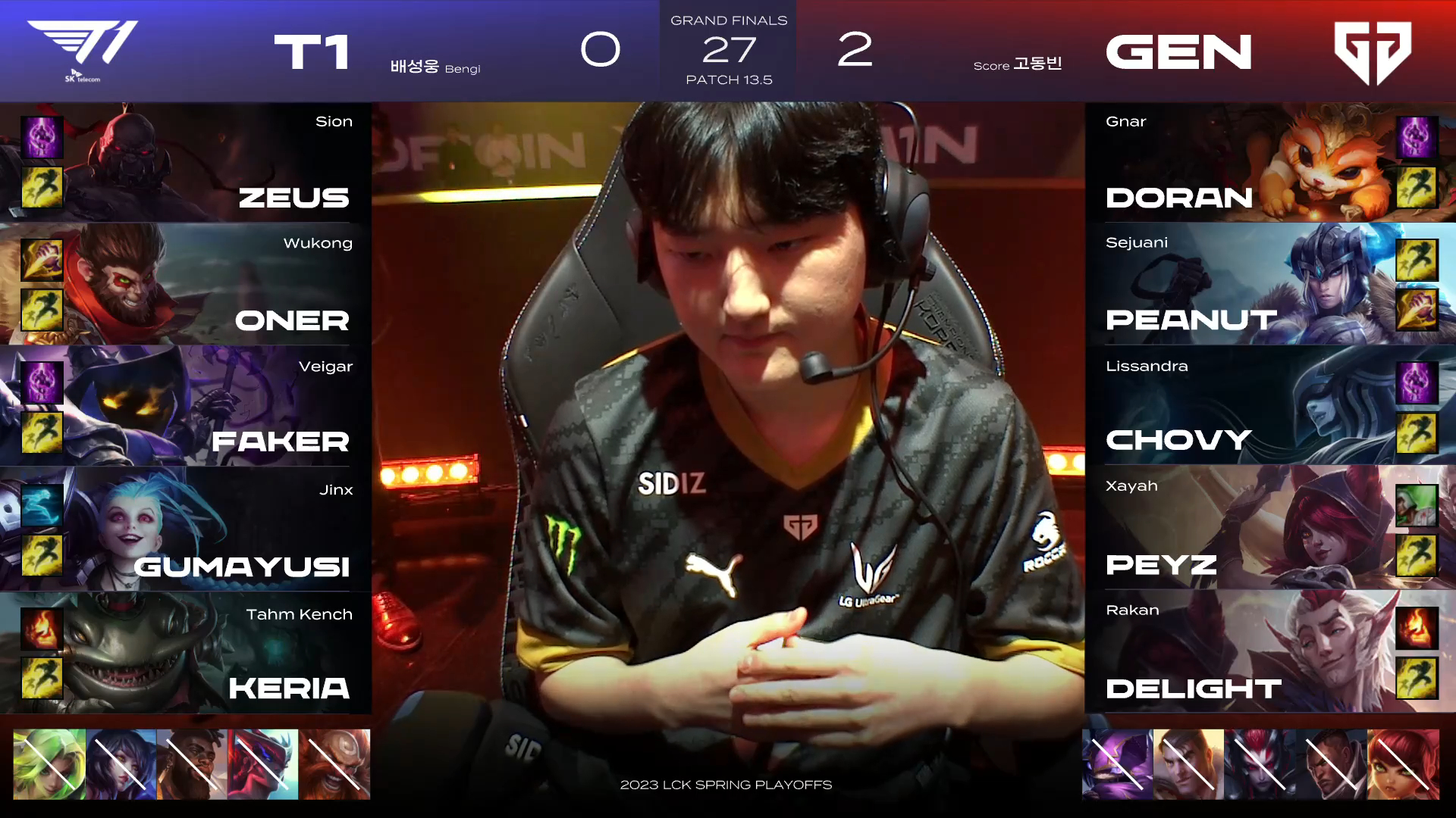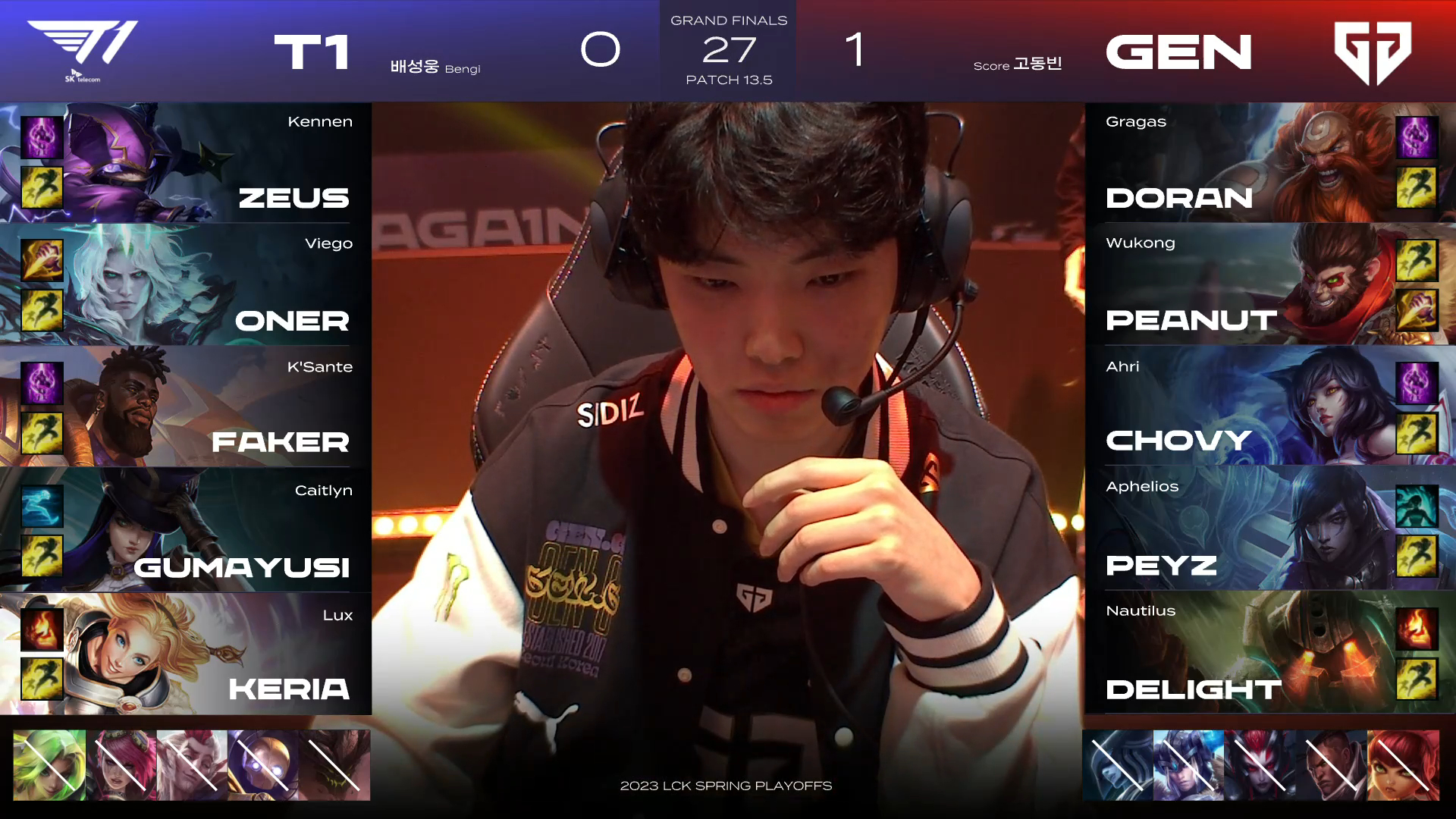 ¶óÀ̾ù °ÔÀÓÁî(ÀÌÇÏ ¶óÀ̾ù) ¡®¸®±× ¿Àºê ·¹Àüµå(League of Legends, ÀÌÇÏ LoL)¡¯ ±¹³» Á¤±Ô ¸®±× ¡®2023 LoL èÇǾ𽺠ÄÚ¸®¾Æ(ÀÌÇÏ LCK)¡¯ ½ºÇÁ¸µ Æ÷½ºÆ®½ÃÁð¿¡¼ Gen.G e½ºÆ÷Ã÷(ÀÌÇÏ Á¨Áö)°¡ T1À» 3:1·Î ²ª°í ¿ì½ÂÇß´Ù.