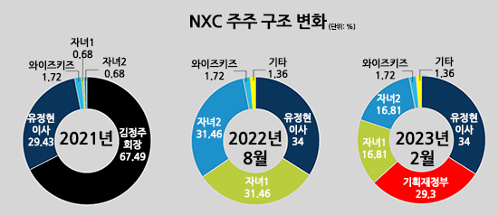 À̸¦ ÅëÇØ NXC ÁöºÐÀº À¯Á¤Çö À̻簡 34%, ±âȹÀçÁ¤ºÎ°¡ 29.3%, µÎ Àڳడ °¢°¢ 16.81%¾¿ ÃÑ 33.62%, ¿ÍÀÌÁîŰÁî°¡ 1.72%, ±âŸ 1.36% ±¸Á¶·Î ¹Ù²î¾ú´Ù. ¿ÍÀÌÁîŰÁî´Â µÎ Àڳడ 50%¾¿ ÁöºÐÀ» º¸À¯ÇÑ À¯ÇÑÃ¥ÀÓȸ»ç´Ù. ÀÌ¿¡ µû¶ó ±èÁ¤ÁÖ È¸Àå À¯Á·ÀÌ º¸À¯ÇÑ NXC ÁöºÐÀº ÃÑ 69.34%´Ù. °æ¿µ±Ç À¯Áö¿¡´Â ¿µÇâÀÌ ¾ø´Â ¼öÁØÀÌ´Ù.