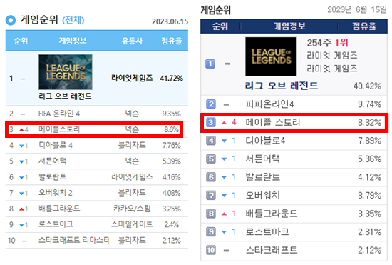 ±¹³» PC¹æ °ÔÀÓ ¼øÀ§ ºÐ¼® »çÀÌÆ® ´õ ·Î±×¿Í °ÔÀÓÆ®¸¯½º¿¡ µû¸£¸é ¡®¸ÞÀÌÇýºÅ丮¡¯´Â 6¿ù 15ÀÏ PC¹æ Àα⠼øÀ§ Á¡À¯À² 3À§¿¡ ¿Ã¶ú´Ù. 6¿ù 14Àϰú ºñ±³Çϸé 4´Ü°è »ó½ÂÇß´Ù. Á¡À¯À²Àº 8%´ë¸¦ ±â·ÏÇß´Ù. PC¹æ À̺¥Æ® ¾øÀÌ ÀÌ·ï³½ ¼º°ú¶ó ´«¿¡ ¶è´Ù.