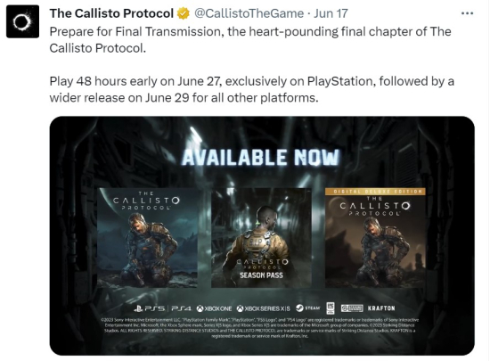 Å©·¡ÇÁÅæ »êÇÏ ½ºÆ®¶óÀÌÅ· µð½ºÅϽº ½ºÆ©µð¿À°¡ °³¹ßÇϰí Å©·¡ÇÁÅæÀÌ À¯ÅëÇÏ´Â 'Ä®¸®½ºÅä ÇÁ·ÎÅäÄÝ'¿¡ ù ½ºÅ丮 DLC 'Final Transmission'ÀÌ Ãâ½ÃµÉ ¿¹Á¤ÀÌ´Ù. Ãâ½Ã ¿¹Á¤ÀÏÀº 6¿ù 27ÀÏÀ̸ç, ¼Ò´Ï Ç÷¹À̽ºÅ×ÀÌ¼Ç Ç÷§Æû¿¡¼ 48½Ã°£ µ¶Á¡ °ø°³µÈ µÚ Ÿ Ç÷§Æû¿¡ Ãâ½ÃµÈ´Ù.