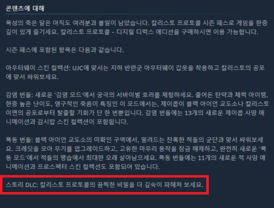 'Ä®¸®½ºÅä ÇÁ·ÎÅäÄÝ'Àº 2022³â 12¿ù 2ÀÏ Ãâ½ÃÇÑ SF »ýÁ¸ °øÆ÷ TPS´Ù. 2320³â ¸ñ¼º À§¼º Ä®¸®½ºÅä¿¡ °Ç¼³µÈ ºí·¢ ¾ÆÀ̾𠱳µµ¼Ò¸¦ ¹è°æÀ¸·Î ÁÖÀΰø Á¦ÀÌÄß ¸®°¡ °Þ´Â Å»Ãâ±â¸¦ ±×·È´Ù. 6¿ù 27ÀÏ Ãâ½Ã ¿¹Á¤ÀÎ 'Final Transmission'Àº 'Ä®¸®½ºÅä ÇÁ·ÎÅäÄÝ' ù ½ºÅ丮 DLCÀ̸ç, Ãâ½ÃÀÏÀ» °ø°³ÇÏ´Â SNS¿¡¼ "°¡½¿ ¶Ù´Â ÃÖÁ¾Àå"À̶ó¸ç ¸¶Áö¸· ½ºÅ丮 DLCÀÏ °¡´É¼ºÀ» ½Ã»çÇß´Ù.