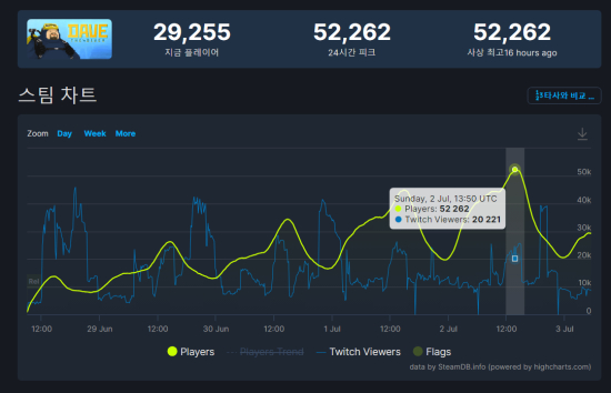 ÀûÁö ¾ÊÀº ½Ì±Û Ç÷¹ÀÌ °ÔÀÓµéÀÌ Á¤½Ä Ãâ½Ã ÈÄ µ¿½ÃÁ¢¼ÓÀÚ ¼ö°¡ Á¡Â÷ Ç϶ôÇÏ´Â ¸ð½ÀÀ» º¸Àδٴ Á¡À» °í·ÁÇϸé 'µ¥ÀÌºê ´õ ´ÙÀ̹ö' µ¿½ÃÁ¢¼ÓÀÚ ¼ö º¯È­´Â ÀÌ·ÊÀûÀÎ ÀÏÀÌ´Ù. ÃÖ°í µ¿½ÃÁ¢¼ÓÀÚ Áõ°¡¿¡´Â ºü¸¥ ¹ö±× ¼öÁ¤ÀÌ ¿µÇâÀ» ¹ÌÃÆÀ» °¡´É¼ºÀÌ ÀÖ´Ù.
