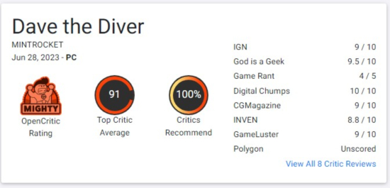 ÀÔ¼Ò¹®µµ ¿µÇâÀ» ¹ÌÃÆÀ» ¼ö ÀÖ´Ù. 'µ¥ÀÌºê ´õ ´ÙÀ̹ö'´Â 7¿ù 3ÀÏ ¿ÀÈÄ 3½Ã ±âÁØ ½ºÆÀ Àüü Æò°¡ 15,734°Ç Áß 97.25%ÀÎ 15,302°ÇÀÌ °ÔÀÓÀ» ±àÁ¤ÀûÀ¸·Î Æò°¡Çϸç '¾ÐµµÀûÀ¸·Î ±àÁ¤Àû'À» ±â·ÏÇϰí ÀÖ´Ù. ¾Õ¼­ ÇØº¸±â ½Ã±â¿¡ ±â·ÏµÈ ±àÁ¤ Æò°¡ 12,256°Ç°ú ºñ±³Çϸé Ãâ½Ã ÈÄ ¾à ³ªÈ길¿¡ ±àÁ¤ÀûÀÎ ¸®ºä 3,046°ÇÀÌ Ãß°¡µÈ ¼ÀÀÌ´Ù. Æò·Ð Á¾ÇÕ ¼­ºñ½º ¿ÀÇÂÅ©¸®Æ½¿¡¼­µµ Æò·Ð°¡ Æò±Õ ÆòÁ¡ 100Á¡ ¸¸Á¡¿¡ 91Á¡, Ãßõµµ 100%¸¦ ȹµæÇϸç '¸¶ÀÌÆ¼' µî±ÞÀ» ºÎ¿©¹Þ¾Ò´Ù.