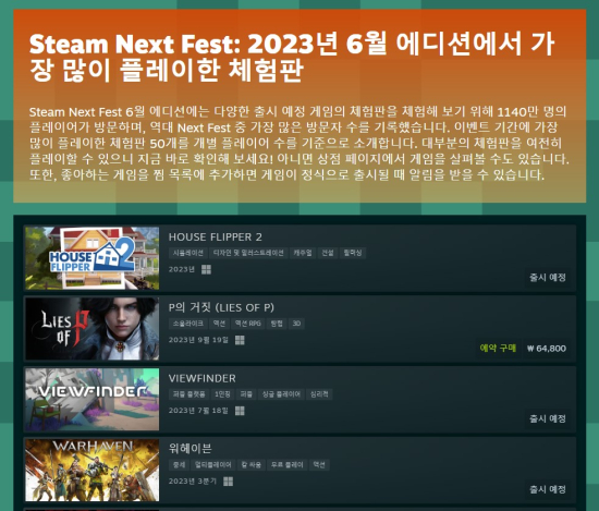 ¹ëºê´Â 6¿ù 20ÀϺÎÅÍ 27ÀϱîÁö ÁøÇàµÈ '½ºÆÀ ³Ø½ºÆ® Æä½ºÆ® 6¿ù ¿¡µð¼Ç' ÃÖ´Ù Ç÷¹ÀÌ ¼øÀ§ »óÀ§ 50°³ ÀÛǰÀ» 7¿ù 12ÀÏ ¹ßÇ¥Çß´Ù. ½ºÆÀ ³Ø½ºÆ® Æä½ºÆ®´Â 1³â¿¡ ¼¼ Â÷·Ê ÁøÇàµÇ´Â ½ÅÀÛ ¼Ò°³ Çà»ç´Ù. AAA±Þ °ÔÀÓºÎÅÍ Àεð °ÔÀÓ±îÁö ¼ö¹é Á¾¿¡ ´ÞÇÏ´Â ½ÅÀÛÀ» µ¥¸ð ¹öÀüÀ¸·Î üÇèÇÒ ¼ö ÀÖ´Ù. À̹ø¿¡ ÃâǰÇÑ ±¹»ê °ÔÀÓ Áß¿¡´Â ³×¿ÀÀ§Áî 'PÀÇ °ÅÁþ'°ú ³Ø½¼ '¿öÇìÀ̺ì'ÀÌ °¢°¢ 2À§¡¤4À§¸¦ ±â·ÏÇß´Ù.