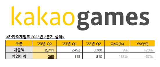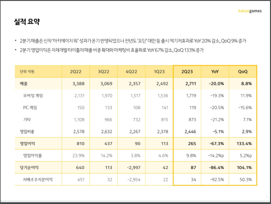 8¿ù 2ÀÏ Ä«Ä«¿À°ÔÀÓÁî 2023³â 2ºÐ±â ½ÇÀû ¹ßÇ¥¿¡ µû¸£¸é ¿¬°á±âÁØ ¸ÅÃâÀº 2,711¾ï ¿ø, ¿µ¾÷ÀÌÀÍÀº 264¾ï ¿øÀ¸·Î °¢°¢ Á÷Àü ºÐ±â ºñ±³ 8.8%¡¤133.4% Áõ°¡, Àü³â µ¿±â ºñ±³ 20.0%¡¤67.3% °¨¼ÒÇß´Ù. ´ç±â¼øÀÌÀÍÀº Á÷Àü ºÐ±â 42¾ï ¿ø¿¡¼ 87¾ï ¿øÀ¸·Î 104.1% Áõ°¡Çß´Ù.