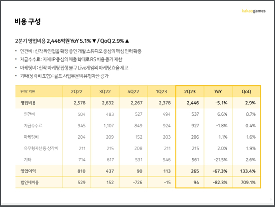 ¿µ¾÷ºñ¿ëÀº 2,446¾ï ¿øÀ¸·Î Á÷Àü ºÐ±â ºñ±³ 2.9% Áõ°¡, Àü³â µ¿±â ºñ±³ 5.1% °¨¼ÒÇß´Ù. ½ÅÀÛ °³¹ßÀ» À§ÇÑ ÀÎ·Â È®Ãæ¿¡ µû¶ó ÀΰǺñ°¡ Áõ°¡ÇÏ°í ½ÅÀÛ ¸¶ÄÉÆÃ ºñ¿ëµµ ÅõÀÔµÆÀ¸³ª, ÀÚü IP Á᫐ ¸ÅÃâÀ» È®´ëÇϰí È¿À²ÀûÀÎ ¸¶ÄÉÆÃÀ» Àü°³ÇØ Áö±Þ¼ö¼ö·á¿Í ¸¶ÄÉÆÃ ºñ¿ë Áõ°¡À²À» ÃÖ¼ÒÈÇß´Ù.