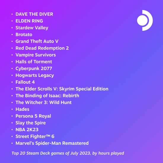 ¹ëºê´Â 8¿ù 2ÀÏ °ø½Ä SNS¸¦ ÅëÇØ 7¿ù Áß ½ºÆÀ µ¦¿¡¼ °¡Àå ¸¹ÀÌ ÆÇ¸ÅµÈ °ÔÀÓ »óÀ§ 20°³¸¦ °ø°³Çß´Ù. 1À§´Â 'µ¥ÀÌºê ´õ ´ÙÀ̹ö', 2À§´Â '¿¤µç ¸µ', 3À§´Â '½ºÅ¸µà¹ë¸®'°¡ Â÷ÁöÇß´Ù. ½ºÆÀ µ¦Àº ¹ëºê°¡ °³¹ßÇÑ °ÔÀÌ¹Ö UMPC·Î, ¹ëºê°¡ ¿î¿µÇÏ´Â ±Û·Î¹ú PC °ÔÀÌ¹Ö Ç÷§Æû ½ºÆÀ(Steam)¿¡¼ ±¸¸ÅÇÑ °ÔÀÓÀ» ÈÞ´ë ±â±â·Î Áñ±æ ¼ö ÀÖµµ·Ï °³¹ßµÆ´Ù.