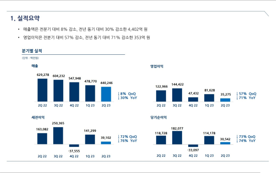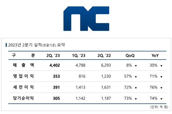 8¿ù 9ÀÏ ¿£¾¾ 2023³â 2ºÐ±â ½ÇÀû ¹ßÇ¥¿¡ µû¸£¸é ¿¬°á±âÁØ ¸ÅÃâÀº 4,402¾ï ¿øÀ¸·Î Àü³â µ¿±â ºñ±³ 30%, Á÷Àü ºÐ±â ºñ±³ 8% °¨¼ÒÇß´Ù. ¿µ¾÷ÀÌÀÍÀº 353¾ï ¿øÀ¸·Î Àü³â µ¿±â ºñ±³ 71%, Á÷Àü ºÐ±â ºñ±³ 57% °¨¼ÒÇß´Ù. ´ç±â¼øÀÌÀÍÀº 305¾ï ¿øÀ¸·Î Àü³â µ¿±â ºñ±³ 73%, Á÷Àü ºÐ±â ºñ±³ 74% °¨¼ÒÇß´Ù.